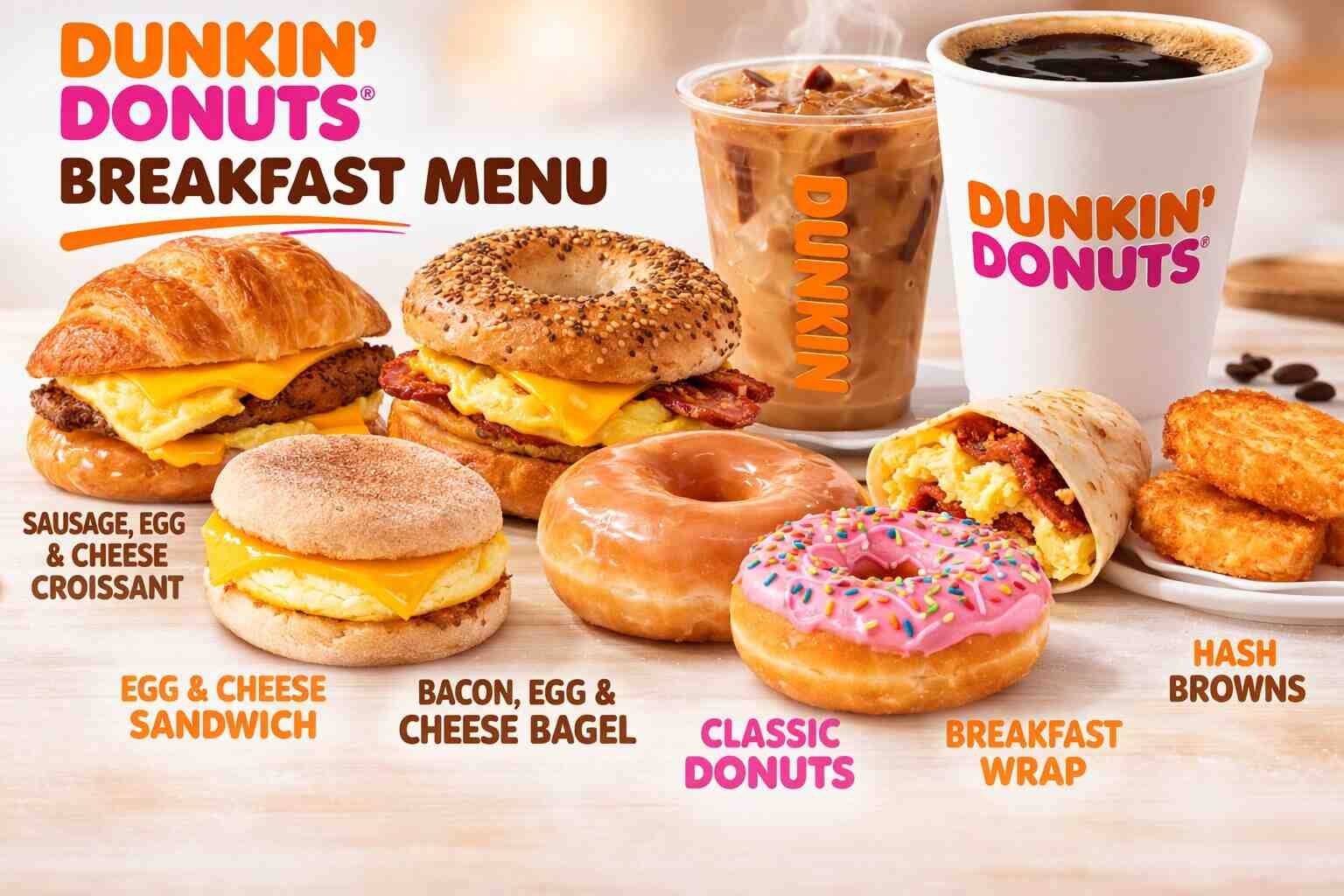 Along with sandwiches, the breakfast menu also includes bakery favorites such as donuts, muffins, bagels, and Munchkins Donut Hole Treats. Many people pair these items with Dunkin’s popular hot or iced coffee, espresso drinks, or cold beverages. Whether you want a quick snack or a filling breakfast meal, the Dunkin breakfast menu provides convenient and flavorful choices for busy mornings. ☕🥯🍩